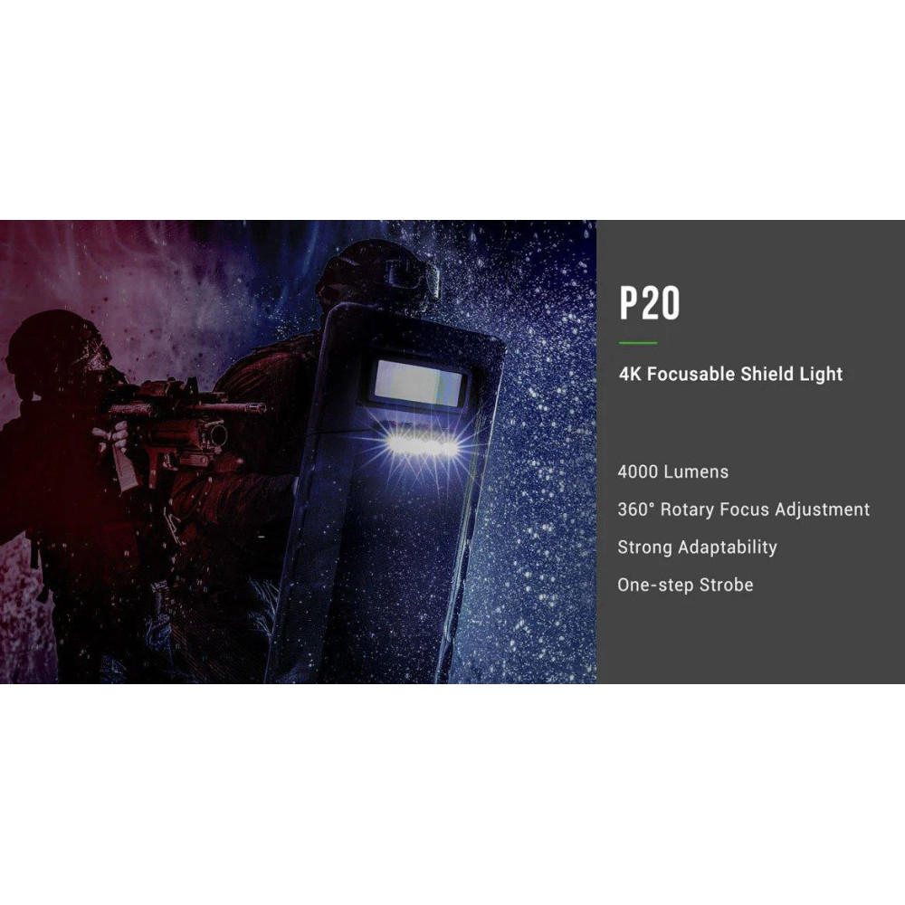 Nextorch P20 مصباح يدوي احترافي مصمم لتلبية احتياجات القوات المسلحة. يُثبّت على الدرع الباليستي باستخدام شريط فيلكرو أو براغي. تبلغ قوة ضوء مصابيح LED الأربعة من OSRAM P9 4000 لومن ، مما يُضلل أي شخص يقف في طريقه بشكل موثوق عند استخدام وضع الوميض . يصل أقصى مدى له إلى 550 مترًا.