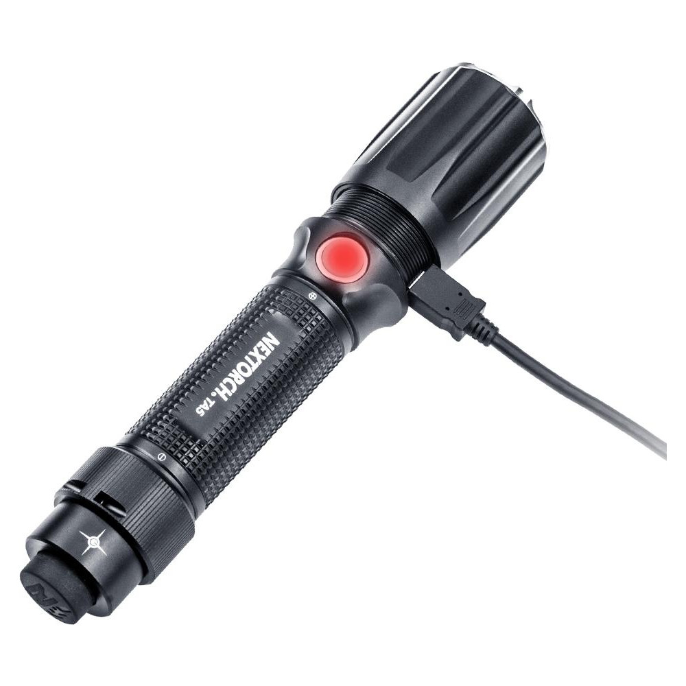 Die taktische LED-Taschenlampe Nextorch TA5 wurde speziell für Profis, z. B. vom Militär, entwickelt. Die TA5 verfügt über zwei Tasten : eine für taktisches Einschalten (Halbdrücken) und sofortiges Einschalten sowie eine für Dauerlicht. Die Lichtleistung von 900 Lumen garantiert eine Reichweite von bis zu 240 Metern . Der Lampenkopf ist mit Keramikspitzen zum Zerschlagen von Glas ausgestattet. Der 18650-Li-Ion-Akku mit einer Kapazität von 2600 mAh kann direkt in der Taschenlampe über den Micro-USB-Anschluss geladen werden .