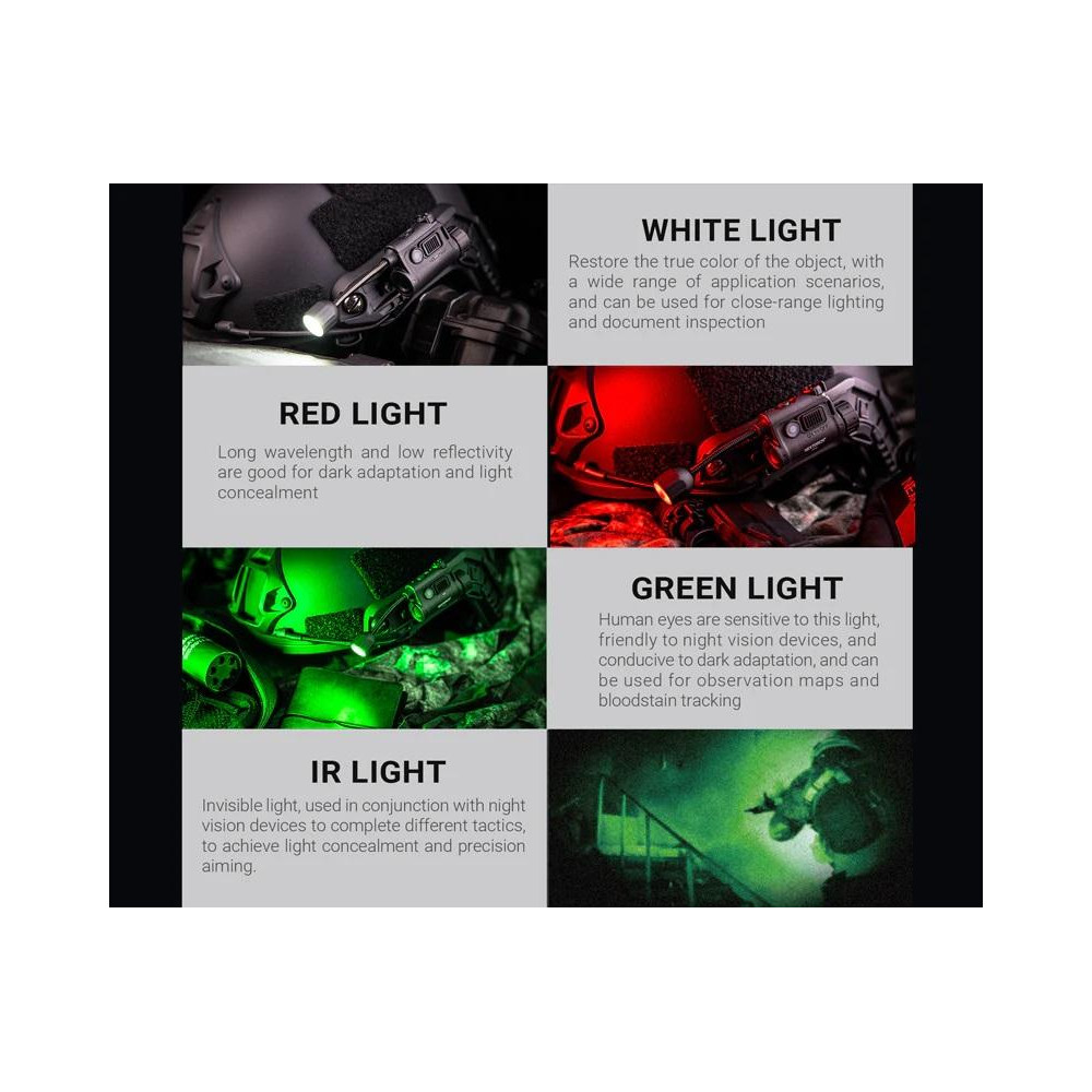 Taktische Helmlampe mit 4 Farbmodi (Weiß, Rot, Grün und Infrarot) und IFF-Signalgeber zur Identifizierung auf dem Gefechtsfeld. Dieses Modell wiegt nur 50 g und beinhaltet eine ARC- Schienenhalterung, eine MOLLE-Schnalle und einen Klettverschluss.