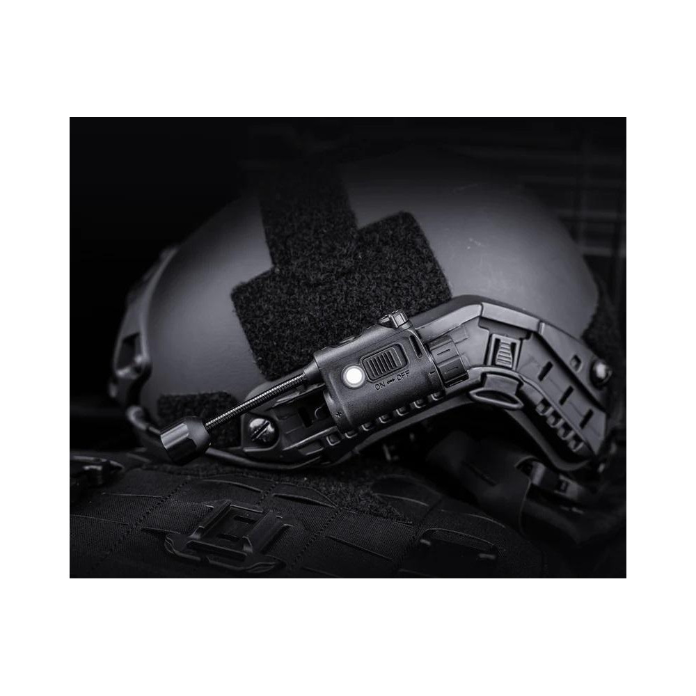 Taktische Helmlampe mit 4 Farbmodi (Weiß, Rot, Grün und Infrarotlicht) und IFF-Signal zur Identifizierung auf dem Gefechtsfeld. Dieses Modell wiegt nur 50 g und ist daher federleicht zu tragen.