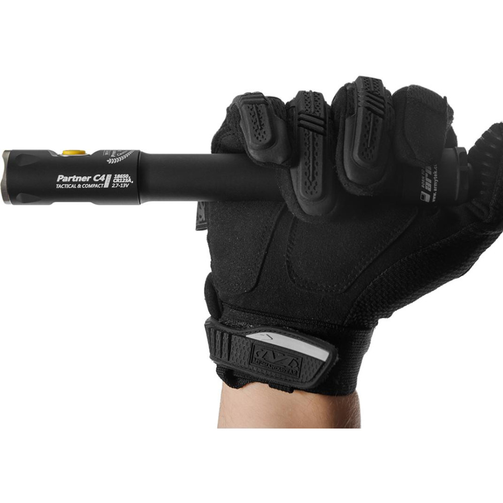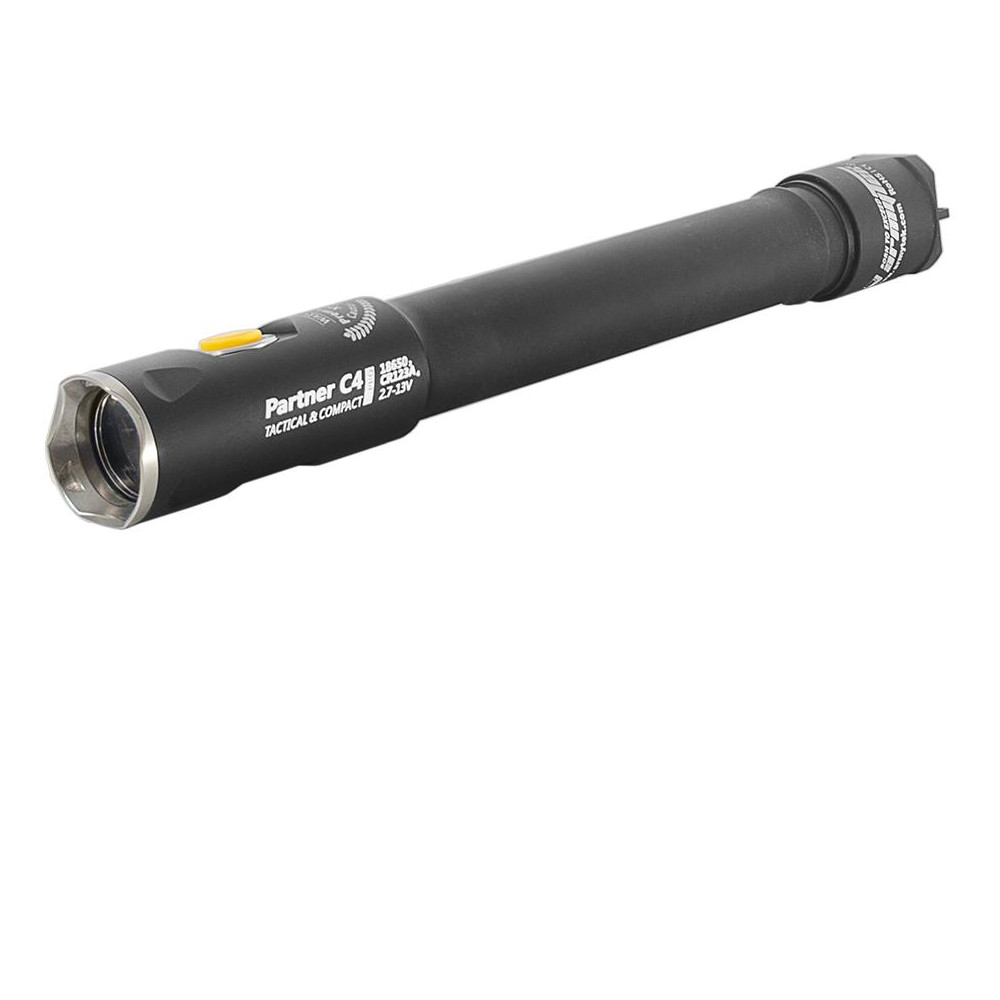 Armytek Partner C4 Pro Main advantages: The high-performance Armytek Partner C4 Pro v3 XHP35 flashlight is made of highly durable aircraft aluminum and its design is particularly suitable for professionals from the police, firefighters, rescuers, but also for hiking, fishing or hunting. The luminous flux is 2140 LED lumens (1675 lm OTF) and the range is up to 209 meters. Power is via 2x18650 Li-Ion, or 4xCR123A batteries. Batteries are not included. The flashlight has a total of 8 light intensity modes (1675 lm - 1.7 lm) and 2 strobe modes. The flashlight's memory allows it to always turn on in the same mode in which it was turned off. Prime uses high-performance Cree XHP35 LEDs with a lifespan of 50,000 hours. For good heat dissipation, the LED is placed on a special copper heat sink. Thanks to the IP68 certification (the highest possible resistance), the impact flashlight is resistant to falls from a height of up to 10 meters and waterproof to a depth of 10 meters. Use: Professional use All kinds of tourism Camping or outdoor Fishing Hunting Everyday use Package contents: Flashlight Partner C4 Pro Spare rubber button Clip Case Lanyard Spare sealing O-rings User manual