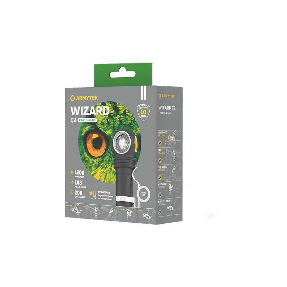 Armytek Wizard C2 white light flashlight Main advantages: New optical system and TIR lens: better light output with comfortable wide dispersion. Maximum LED efficiency: the Wizard C2 flashlight reaches an output of up to 1200 lumens instead of 1000 lm. New head design: improved heat dissipation and brighter light with more lumens. Enlarged side button: softer and more comfortable to press. Upgraded electronics and firmware: extended runtime and better brightness. Stylish body: matte anodized, laconic style, new corporate branding. New magnetic charger: the flashlight charges 2x faster (3 h 20 min). Use: Sports activities All kinds of tourism Camping or outdoors Cycling Fishing Everyday use Professional use Package contents: Armytek Wizard C2 flashlight 1 pc rechargeable battery 1x18650 Li-Ion (3200 mAh) Magnetic USB charger Headband with adapter Clip Replacement sealing O-rings User manual