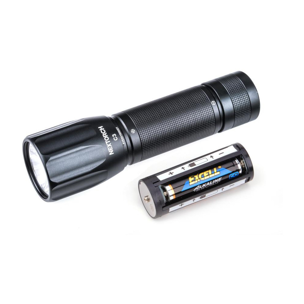 The Nextorch C3 flashlight has a maximum output of 380 lm and a range of up to 190 m in a narrow cone of light. The C3 offers 3 power modes that can be easily switched as needed. The flashlight body is made of aircraft aluminum with fine knurling for improved grip. It is powered by 3x AAA batteries with a battery life of up to 30 hours on a lower mode.