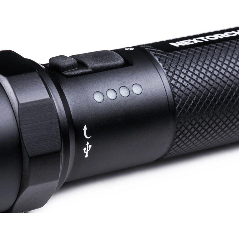 Nextorch P81 Flashlight Main advantages: The maximum output of the LED diode is 2600 lumens with a range of up to 310 meters. New head design with nano-ceramic tips for breaking windows. Two buttons, one for switching modes and the other for instantly turning on the strobe. By default, you will find 4 classic lighting settings modes + strobe. Battery charge indication using 4 diodes on the side of the flashlight. Hidden USB port for easy charging of the flashlight using a cable. Compact size for more comfortable wearing on duty. The flashlight is made of aviation aluminum, so it is very light and durable at the same time. Power source: rechargeable battery 1x21700 4800 mAh. Use: Professional use Search and rescue operations Security activities Everyday use On hikes and trips Package contents: Nextorch P81 Flashlight Li-Ion 21700 battery (4800 mAh) Micro USB charging cable Wrist strap
