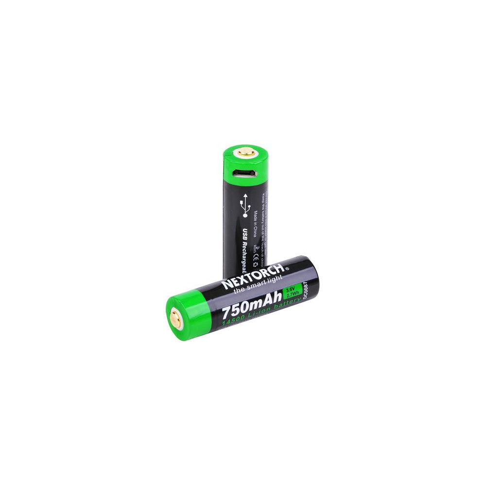 Batería recargable Nextorch 14500 de iones de litio con una capacidad de 750 mAh. Se carga mediante un puerto micro USB directamente en la batería. El cargador está incluido en el paquete.