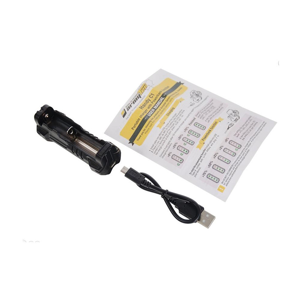 El cargador universal Armytek Handy C1 Pro se ajusta automáticamente al tipo de batería, nivel óptimo de corriente y nivel de carga. Se puede cargar de forma tradicional en un coche o portátil mediante un cable USB, o enchufarlo a una toma de 230 V con un adaptador.