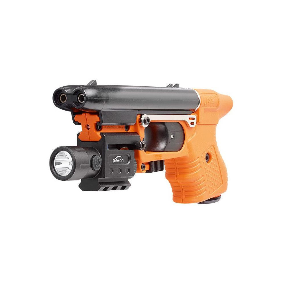 Linterna táctica con luz estroboscópica de 180 lúmenes. Gracias a la versatilidad del riel Picatinny, se puede añadir un láser a la JPX y a la JPX4 (así como a otras armas con el mismo sistema).