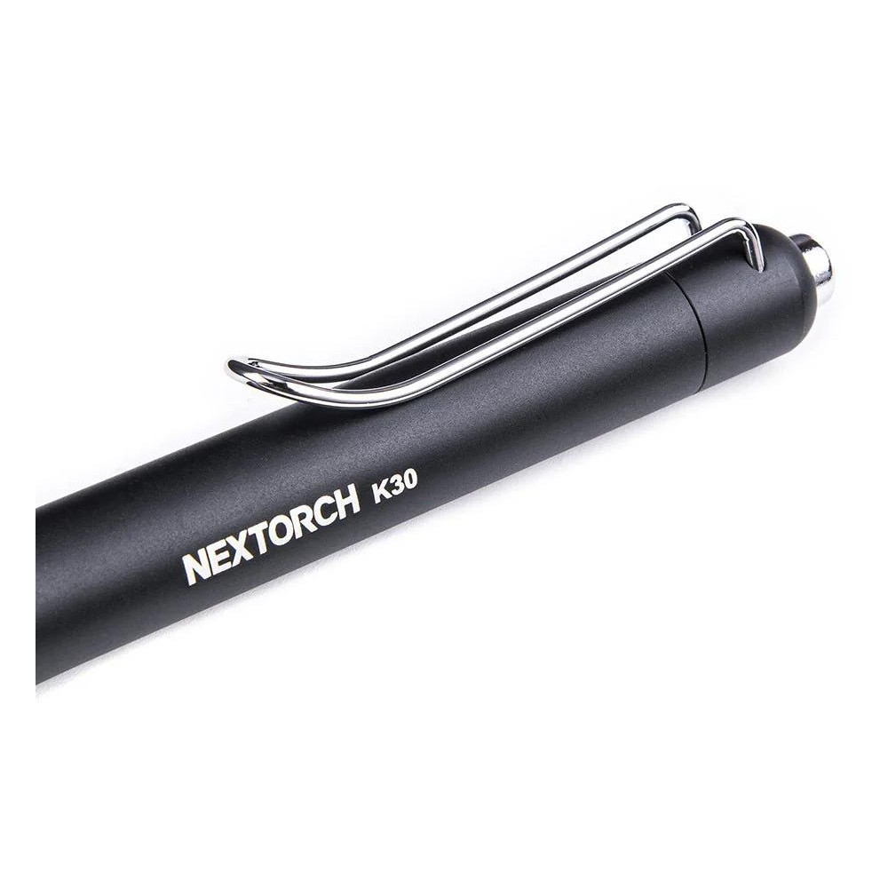 La torcia Nextorch K30 ha le dimensioni di una penna e ha una notevole potenza luminosa fino a 850 lm . Questo la rende la scelta ideale per il trasporto quotidiano. Il corpo è realizzato in Realizzata in alluminio aeronautico con una pratica clip metallica all'estremità. La torcia è alimentata da 2 batterie AAA standard .