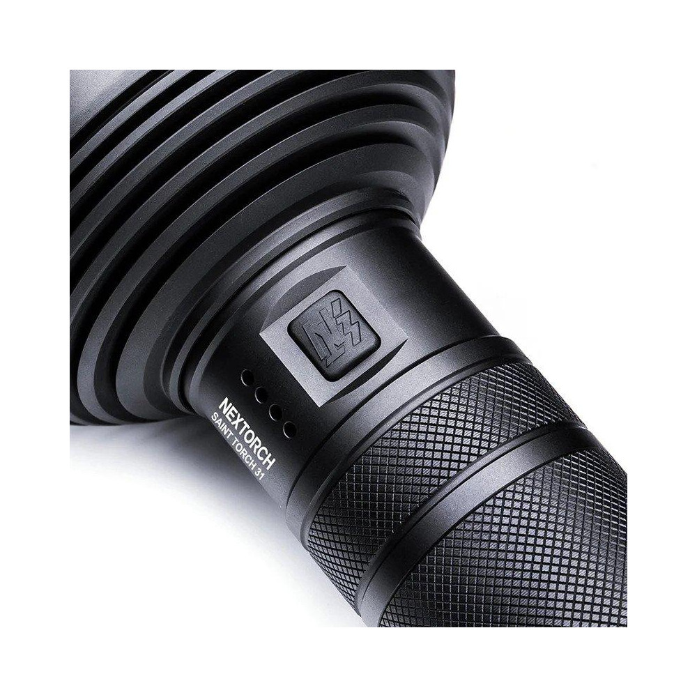 Nextorch Saint Torch 31 è una torcia ad alte prestazioni che utilizza colori bianco neutro con una potenza incredibilmente elevata di 20.000 lumen e una portata fino a 740 m . La batteria ad alta capacità si ricarica completamente in 3 ore utilizzando un caricabatterie universale USB-C; il livello di carica della batteria è indicato da 4 LED vicino al pulsante di accensione. La torcia può anche essere utilizzata come power bank impermeabile per un telefono cellulare o un tablet. Saint Torch 31 può essere comodamente trasportata su lunghe distanze o trasportata in una pratica borsa grazie alla tracolla.