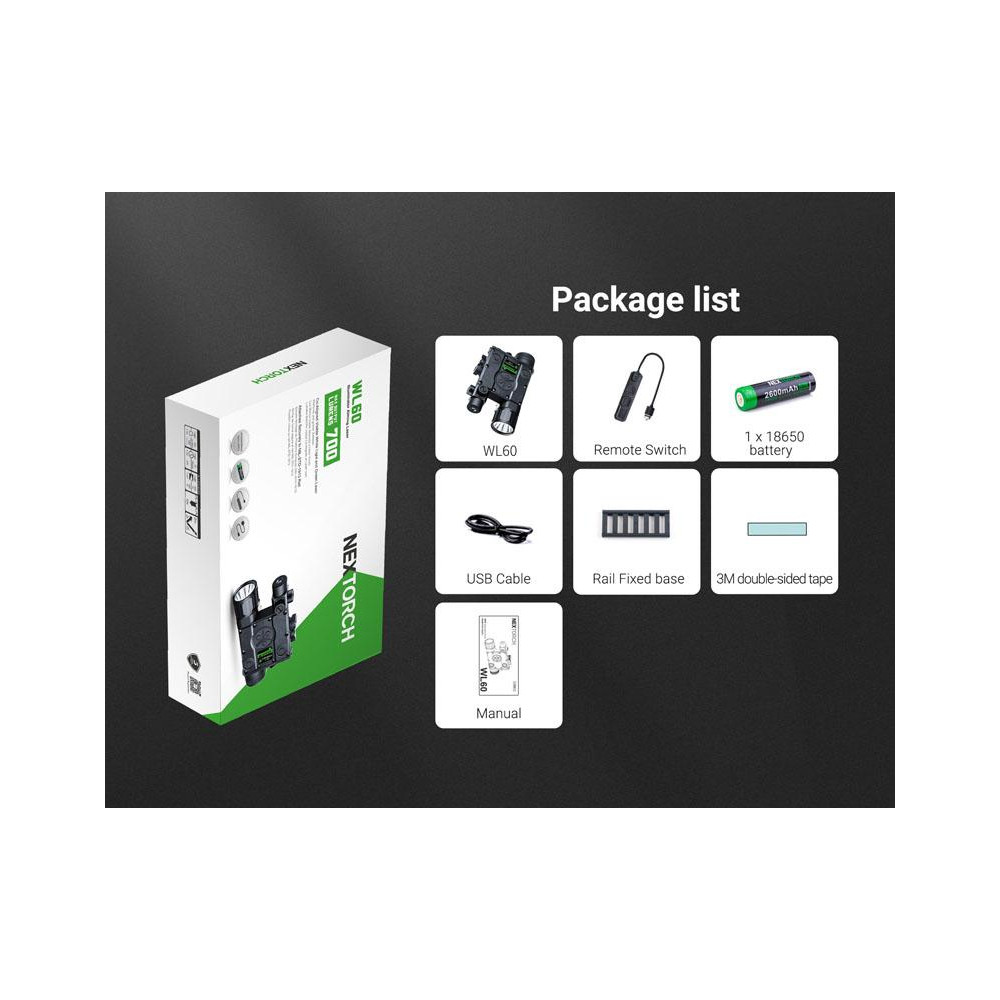 La torcia tattica Nextorch WL60 con laser verde raggiunge un'emissione luminosa di 700 lumen con una portata fino a 320 metri. È dotata di interruttori indipendenti con controllo semplice e intuitivo , che ne consentono l'utilizzo in qualsiasi operazione tattica. Le tre modalità di illuminazione possono essere facilmente commutate tramite il telecomando incluso nella confezione. L'innovativo sistema Rail Mount è adatto a tutti i tipi di binari standard. La torcia è compatibile con 1 batteria ricaricabile agli ioni di litio 18650 e 2 batterie CR123A per diverse opzioni di alimentazione.