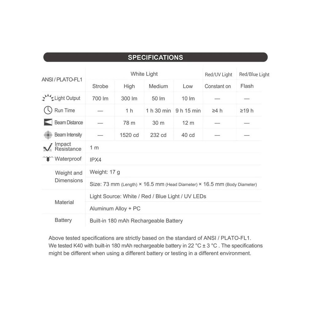 A Nextorch K40 é uma lanterna compacta que você pode pendurar no seu chaveiro e ter sempre à mão. Apesar do tamanho pequeno, ela oferece um desempenho surpreendente. Este modelo utiliza um total de 4 LEDs (branco, vermelho, azul e UV).