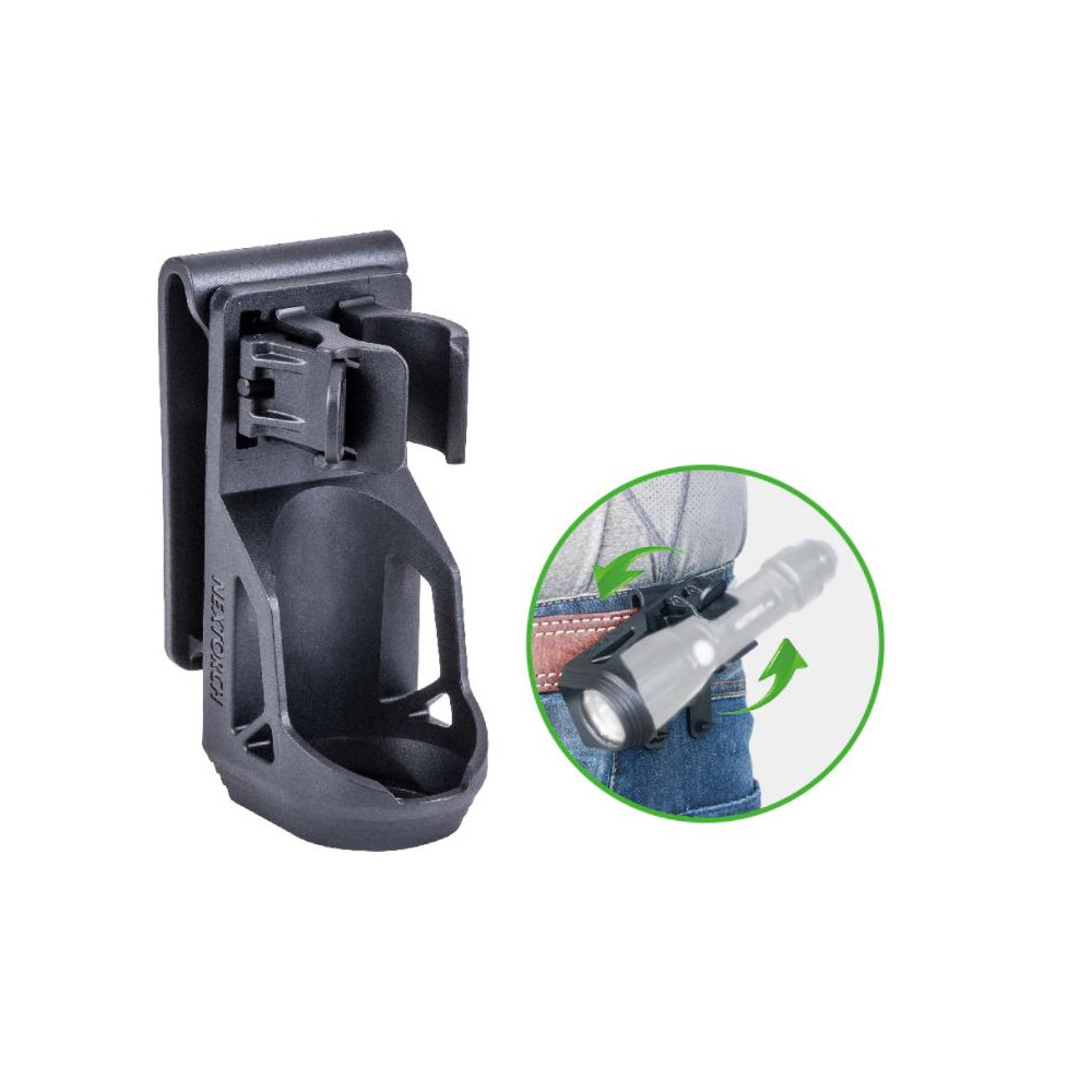 Coldre tático resistente, feito de polímero, para lanternas Nextorch, que pode ser facilmente fixado ao cinto e girado 360°.