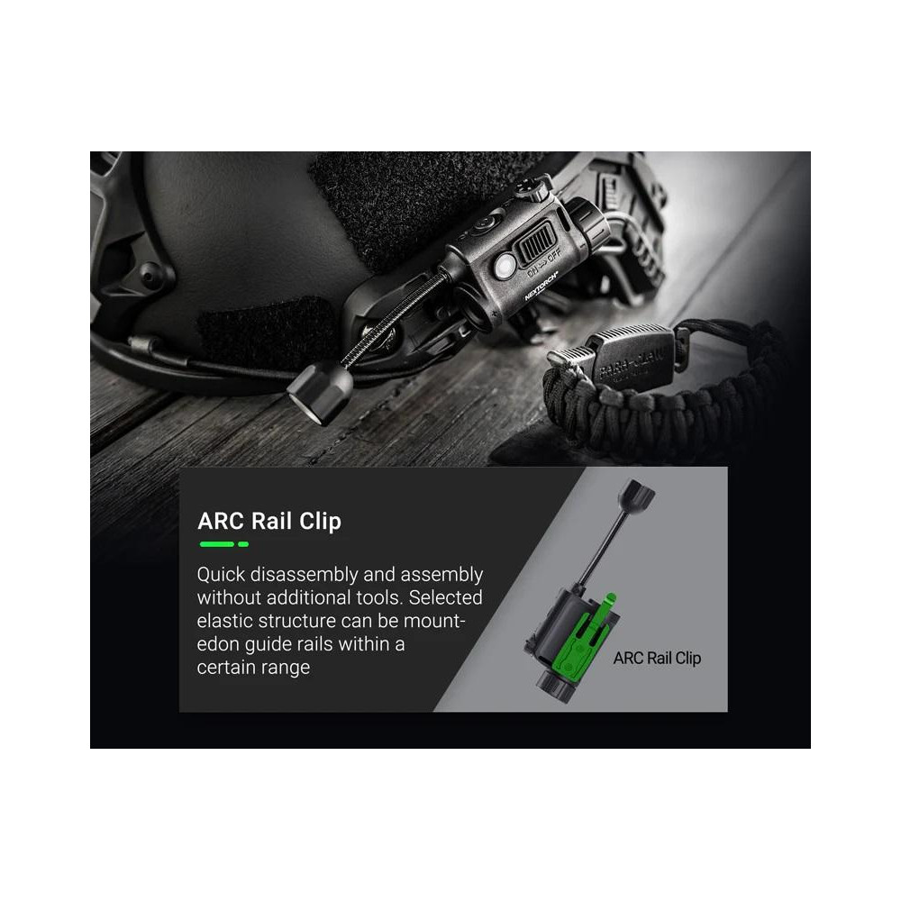Lanterna tática para capacete com 4 modos de cor (branco, vermelho, verde e infravermelho) e sinalizador IFF para identificação no campo de batalha. Este modelo pesa apenas 50 g e inclui suporte para trilho ARC , fivela MOLLE e tira de velcro.