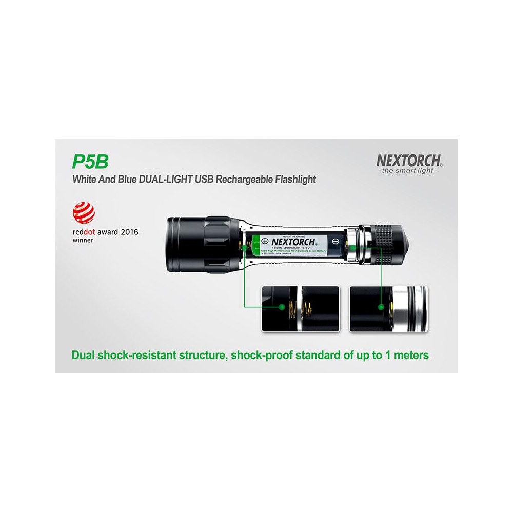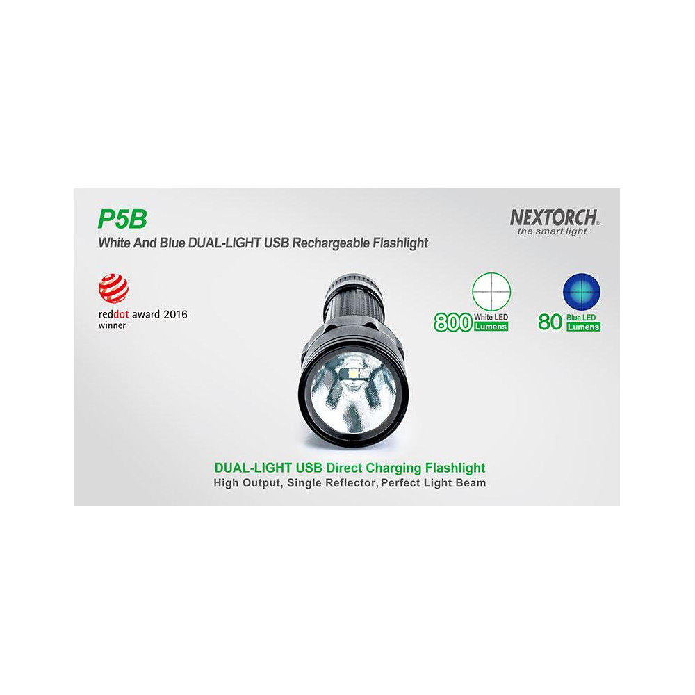 A lanterna Nextorch P5B possui um modo de iluminação duplo graças a um LED branco de 800 lm e um LED azul de 80 lm . A troca de modos é feita girando o anel na cabeça da lanterna. O botão duplo permite alternar a intensidade da luz entre os modos mais alto e mais baixo quando pressionado. A P5B é alimentada por uma bateria 18650 ou duas CR123A, e o carregamento pode ser feito diretamente na lanterna através de uma porta micro USB escondida na extremidade.
