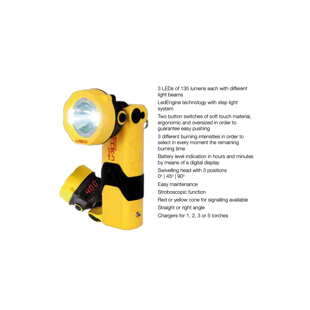 L3000 имеет вращающуюся головку, наклон которой регулируется в диапазоне от 0° до 45° и 90°. Корпус лампы изготовлен из высокопрочного термопластичного полимера. Сертифицирован ATEX для зоны 0, уровень защиты IP67.