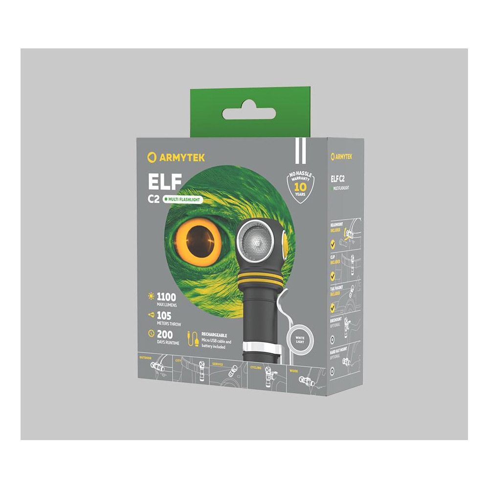 Новая версия популярного налобного фонаря Armytek Elf C2 v2 с простым управлением и универсальным разъёмом для удобной зарядки дома, в офисе или на природе. Многофункциональный фонарь с яркостью до 1100 люмен и дальностью освещения до 105 метров для отдыха на природе, спорта, ремонта и профессионального использования. Elf C2 v2 может работать до 6,5 месяцев в режиме минимальной яркости. При подключении к любому источнику питания USB и извлечении аккумулятора он работает как настольная лампа с неограниченным временем работы.