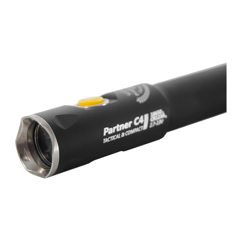 Armytek Partner C4 Pro Основные преимущества: Высокопроизводительный фонарь Armytek Partner C4 Pro v3 XHP35 изготовлен из высокопрочного авиационного алюминия, а его конструкция особенно подходит для профессионалов из полиции, пожарных, спасателей, а также для пеших прогулок, рыбалки или охоты. Световой поток составляет 2140 светодиодных люмен (1675 лм OTF), а дальность действия — до 209 метров. Питание осуществляется от 2 батареек 18650 Li-Ion или 4 батареек CR123A. Батарейки в комплект не входят. Фонарь имеет в общей сложности 8 режимов интенсивности света (1675 лм - 1,7 лм) и 2 режима стробоскопа. Память фонаря позволяет ему всегда включаться в том же режиме, в котором он был выключен. Prime использует высокопроизводительные светодиоды Cree XHP35 со сроком службы 50 000 часов. Для хорошего отвода тепла светодиод помещен на специальный медный радиатор. Благодаря сертификации IP68 (максимальная защита) ударный фонарь выдерживает падения с высоты до 10 метров и водонепроницаем на глубине до 10 метров. Применение: Профессиональное использование Все виды туризма Кемпинг или отдых на природе Рыбалка Охота Повседневное использование Комплектация: Фонарь Partner C4 Pro Запасная резиновая кнопка Клип-кейс Темляк Запасные уплотнительные кольца Руководство пользователя
