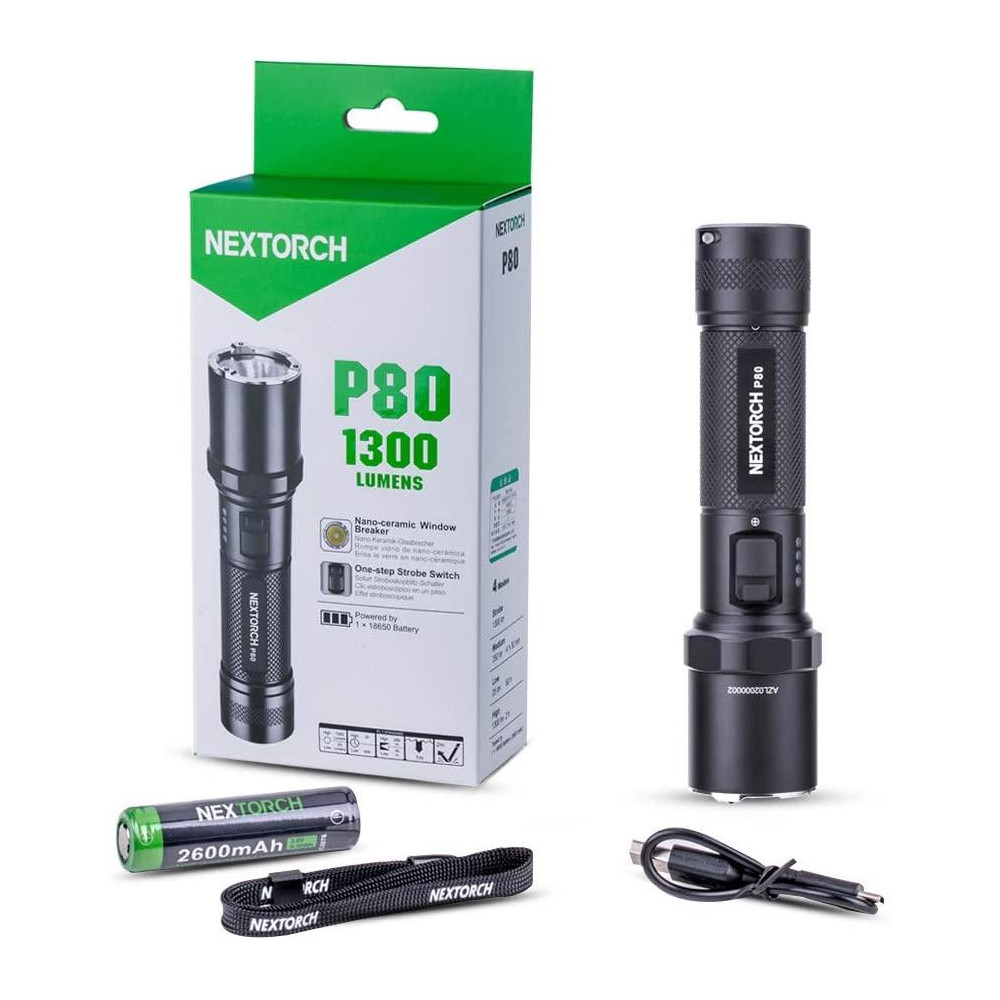 Фонарик Nextorch P80 обладает максимальной яркостью до 1300 люмен и дальностью освещения 280 метров . Оптимальный режим для повседневного использования — 350 люмен, а время работы — до 4,5 часов. Благодаря двум расположенным рядом кнопкам, вы можете легко переключать режимы или включать стробоскоп. Нанокерамические шарики, расположенные на переднем кольце фонарика, обеспечивают удобство использования в опасных ситуациях, например, при разбивании стекла. Зарядка фонарика осуществляется с помощью USB-кабеля.