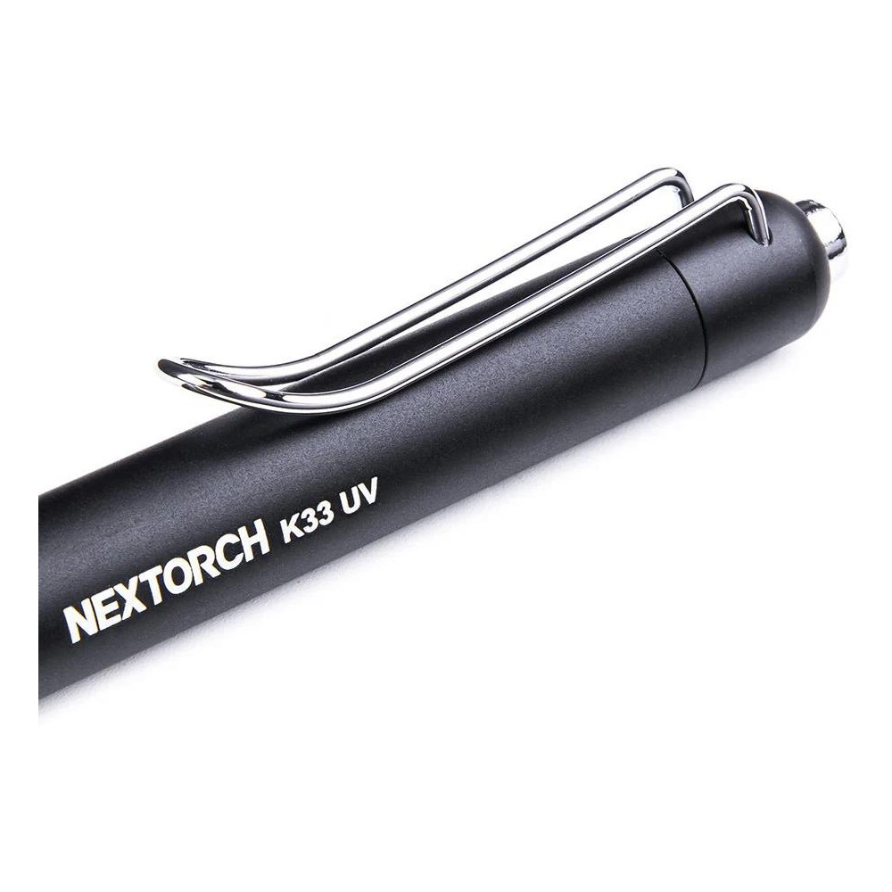 Vreckové svietidlo Nextorch K33 UV ponúka profesionálnu detekciu ultrafialového žiarenia v diskrétnom prevedení vo veľkosti pera. Tento zdroj UV žiarenia s vlnovou dĺžkou 365 nm, určený na spracovanie dôkazov a overovanie dokumentov, vyžaruje pôsobivý výkon 1300 mW filtrovaného UV žiarenia. Nabíjanie 2x AAA batériami.
