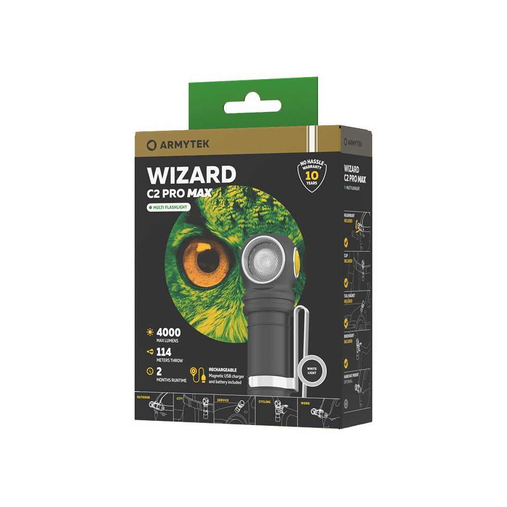 Armytek Wizard C2 Pro Max je najnovším modelom celosvetovo známeho multifunkčného radu svietidiel Armytek Wizard. Nielen jasný, ale úžasný svetelný výkon 4000 lúmenov a dosvit až 114 metrov robí z tohto svietidla zatiaľ najsilnejší zdroj svetla medzi viacúčelovými svietidlami Armytek. Široké svetlo svietidla je optimálne, ako na používanie na krátku vzdialenosť, tak na osvetlenie veľkých priestorov. Nabíjanie prebieha pomocou inovovanej magnetickej USB nabíjačky. Silný magnet v koncovke umožňuje pripevnenie svietidla na akýkoľvek kovový povrch. Súčasťou balenia je navyše nylonové púzdro a adaptér pre batérie 18650.